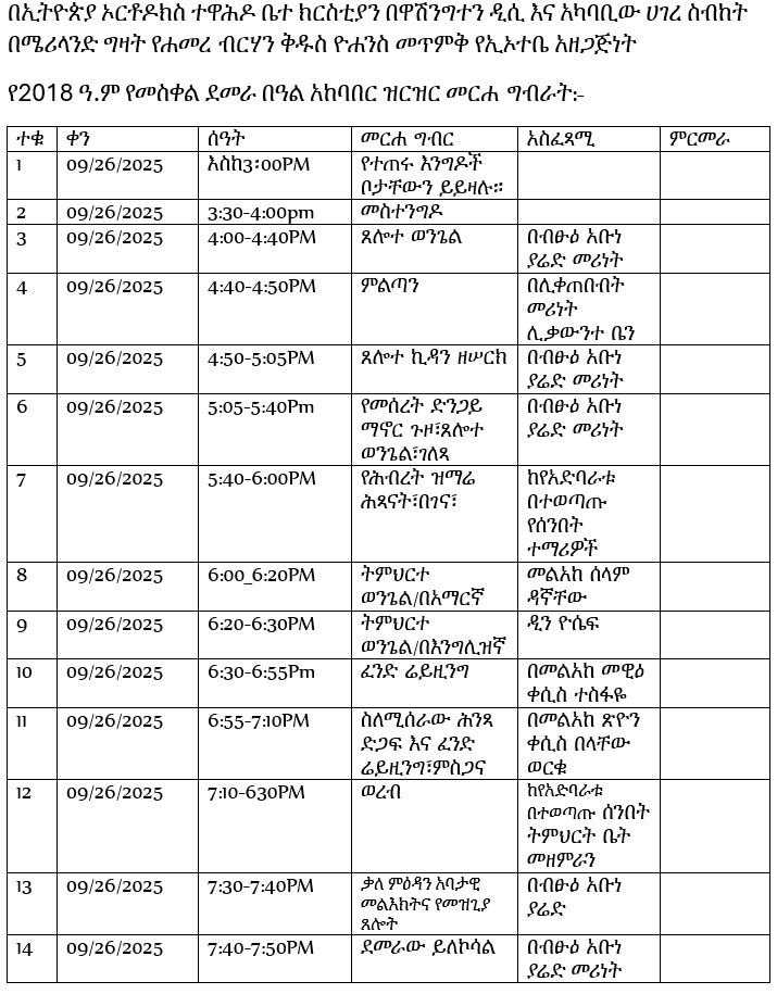 This year’s celebration will take place on Friday, September 26, 2025, starting at 3:00 PM at Hamere Berhan Kidus Yohannes EOTC, located at 4115 Muncaster Mill Road, Rockville, MD. The day will be marked with vibrant liturgical services, joyful hymns, and the spirit of unity that has carried generations of believers.